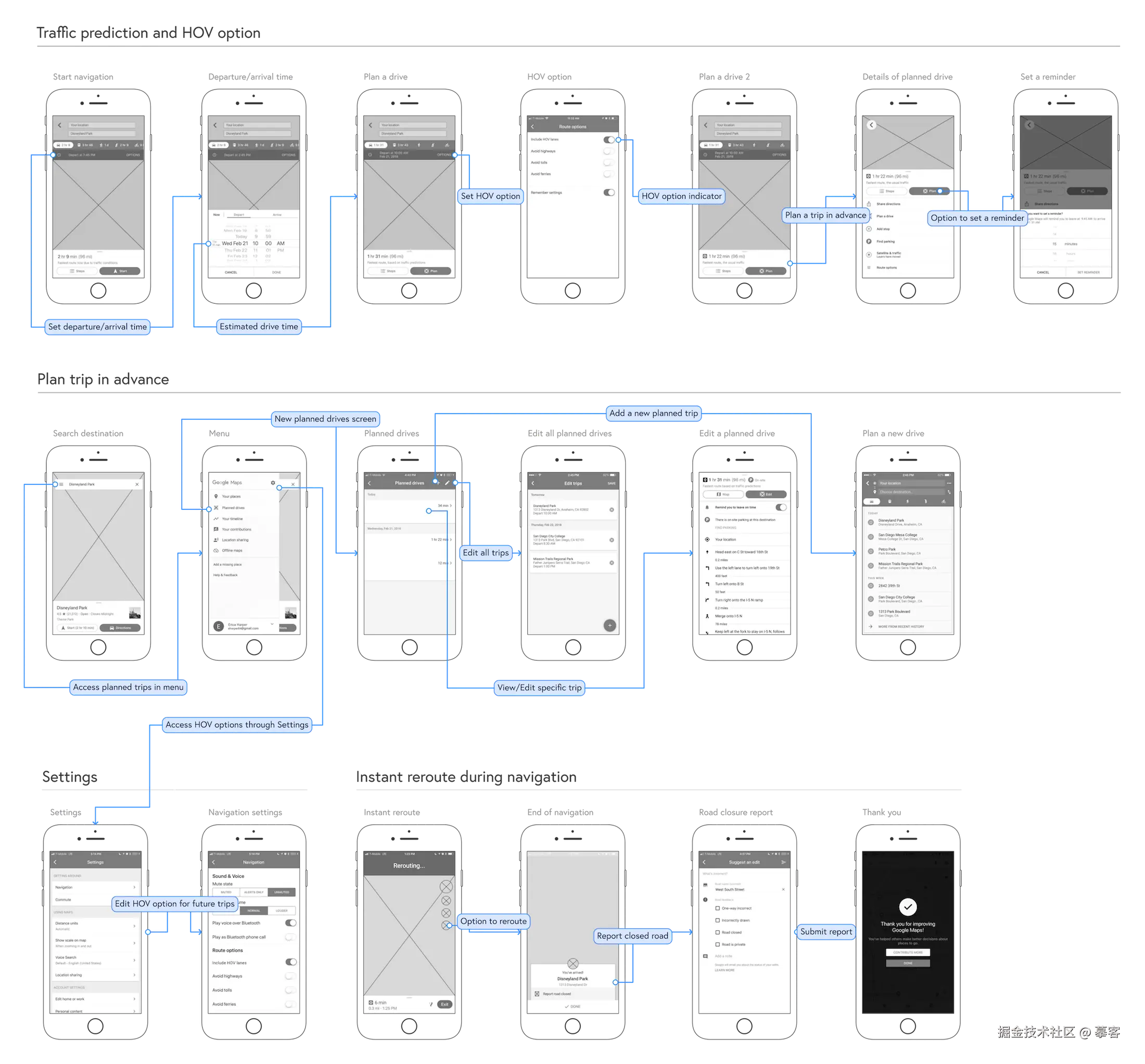 Google Maps 是一款全球知名的地图导航应用。Google Maps 的线框图展示了地图的缩放、平移、旋转等操作功能,用户能够方便地查看不同地区的地图信息。在导航功能的线框图设计上,展示了起点和终点的输入、路线规划、导航提示等功能,用户能够轻松地获取导航信息。此外,Google Maps 的线框图还展示了交通预测、行程计划等新功能。