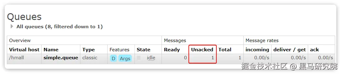 在异常位置打断点,再次发送消息,程序卡在断点时,可以发现此时消息状态为unacked(未确定状态):