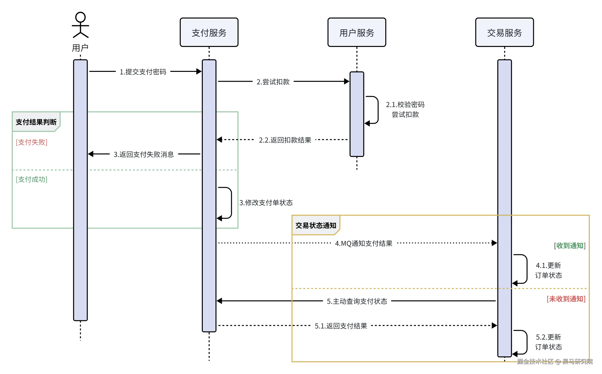 图中黄色线圈起来的部分就是MQ通知失败后的兜底处理方案,由交易服务自己主动去查询支付状态。