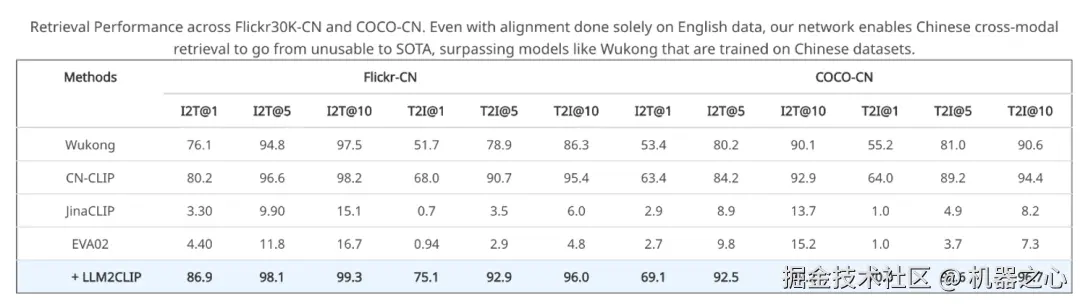值得注意的是, LLM2CLIP 可以让完全用英文训练的 CLIP 模型,在中文检索任务中超越中文 CLIP。