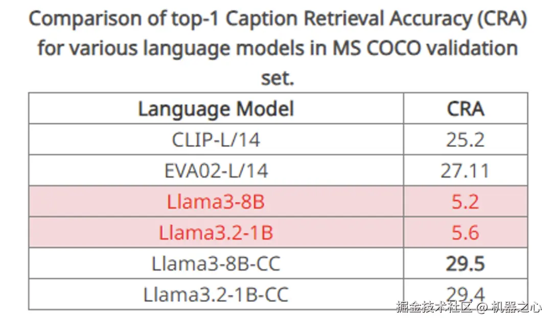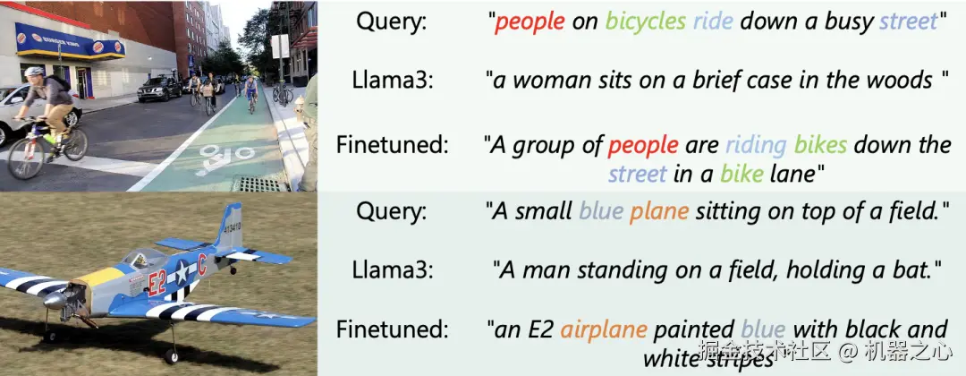 他们发现原生的 llama3 8B 甚至无法找到十分匹配的 caption,例如 plane 和 bat 的距离更近,但是离 airplane 的距离更远,这有点离谱了,因此它只取得了 18.4% 的召回率。