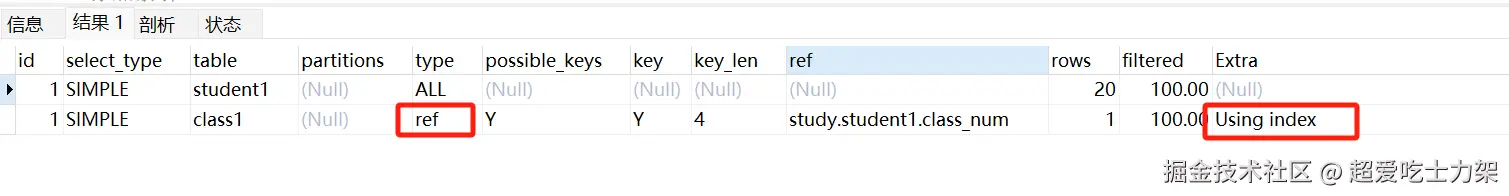 可以看到第二行的 type 变为了 ref,rows 也变成了优化比较明显。这是由左连接特性决定的。LEFT JOIN条件用于确定如何从右表搜索行,左边一定都有,所以 右边是我们的关键点,一定需要建立索引 。