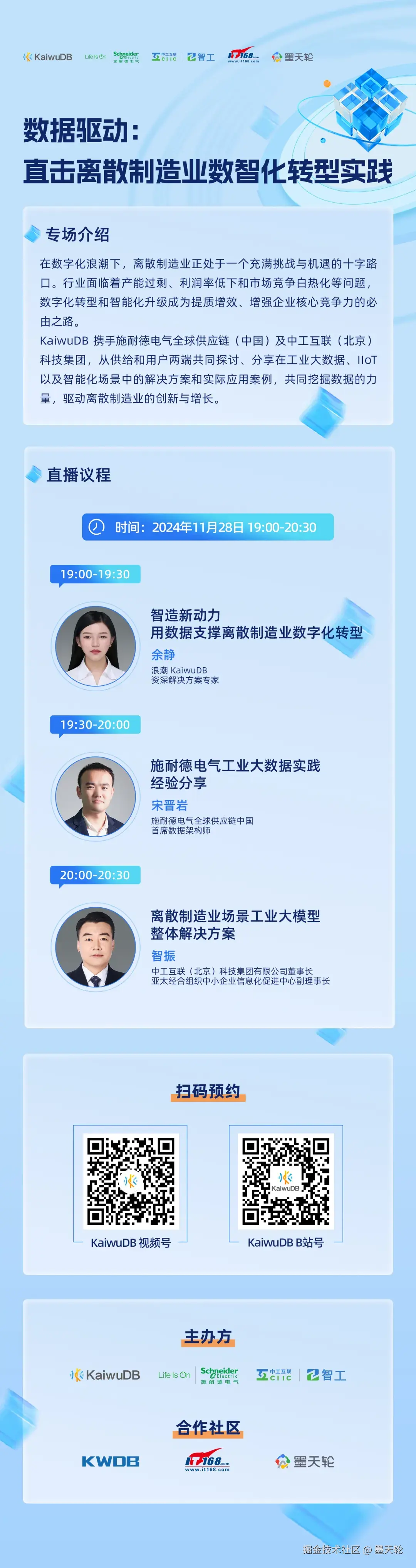11月28日,KaiwuDB 携手施耐德电气全球供应链中国及中工互联联合发起《数据驱动:直击离散制造业数智化转型实践》主题直播,针对离散制造业大数据、IIoT 及智能化场景的需求及挑战,和大家深度分享离散制造业场景解决方案及落地实践。