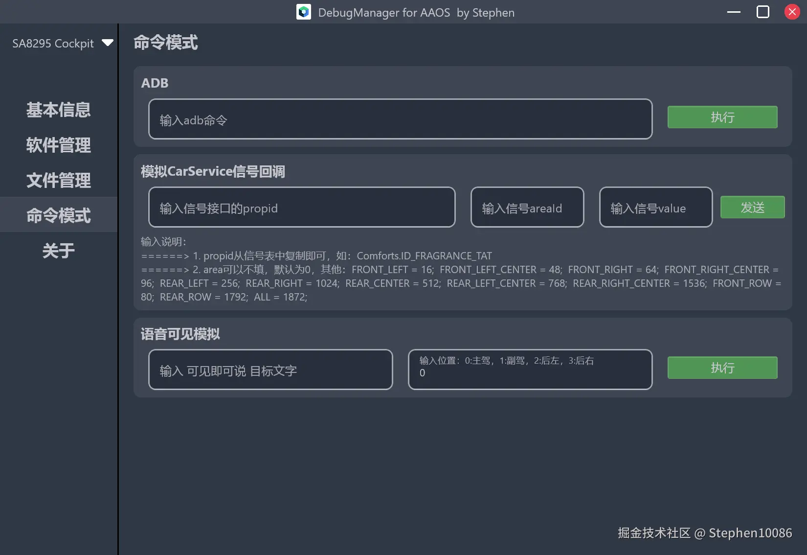 除了最基础的adb命令透传,配合系统厂商Android端的可执行二进制程序,可以模拟车载信号的回调操作。还有语音部门的通过广播来调试的路径,整合到了DebugManager里面,一键发送广播,模拟可见扫描的点击。