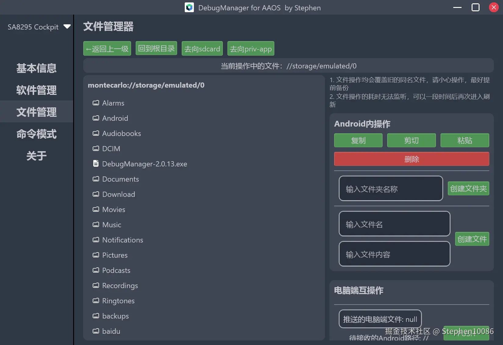 最开始的展示列表我是直接执行了"ls /"将列表发送到界面,显示根目录,解析出其中的文件文件夹,继续往子目录的话就把路径拼接起来,比如进入sdcard,就执行"ls /sdcard",继续深入则再次拼接。同时最上方设置了返回上级,回到根目录和priv-app快捷按钮。