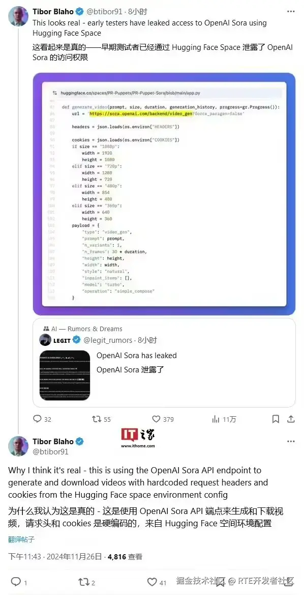 科技媒体 TechCrunch 昨日(11 月 26 日)发布博文,报道称名为「Sora PR Puppets」的组织为抗议 OpenAI 的「欺骗行为」和「艺术洗白」,于本周二在 Hugging Face 平台泄露了对 OpenAI 视频生成模型 Sora 的访问权限。