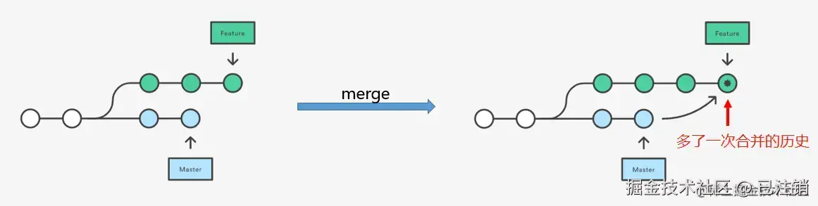 - git merge 优点是分支代码合并后不破坏原分支代码的提交记录,缺点是会产生额外的提交记录并进行两条分支的合并