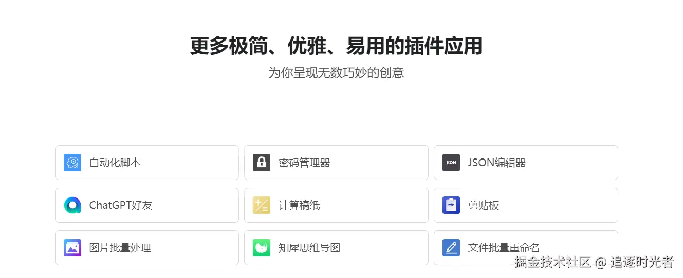 - 插件化:uTools的强大功能完全取决于其插件系统。用户可以根据自己的需要,自由选配丰富的插件,如计算器、翻译、截图、音乐播放器、文件搜索等,打造属于自己的工具集合。目前已有100+的插件供用户选择,每个插件解决一个具体场景的问题,简洁美观、即用即走。