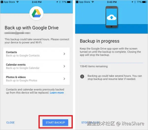 - 选择“设置 > 备份 > 开始备份”将您的 iPhone 备份到 Google Drive。