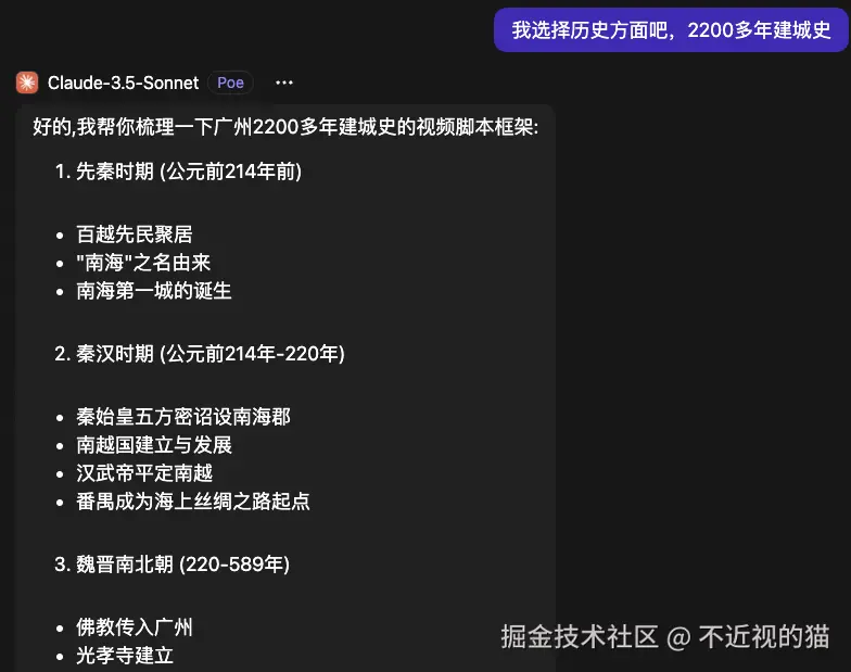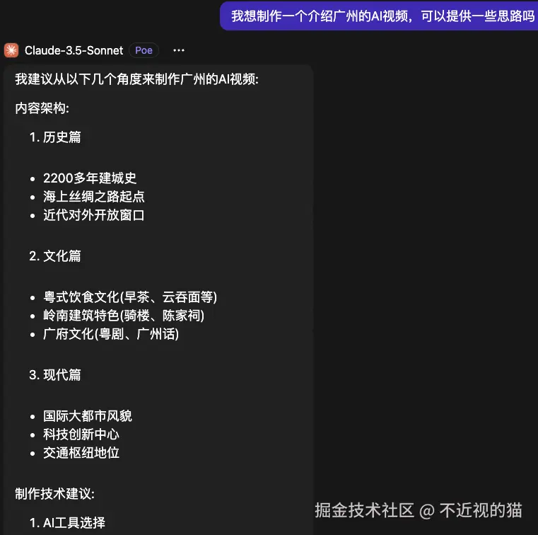 首先,我们得明确剧本走向,例如我要做介绍广州的视频,那我得从什么方向去开始介绍,要介绍什么,这个我们可以先问问 AI,看看能不能找点思路: