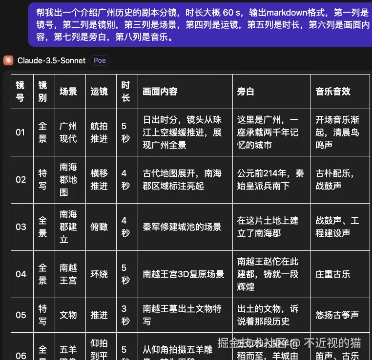 我们的视频大致时长得初步估计,不同时长要介绍的颗粒度是不一样的,同样是广州的历史,30 s 和 60 s,若两个场景数一样,那 60s 的场景分镜一定会更多,若两个场景数可以不一致,那 60s 的场景明显得更多,这个大家可以都能理解,就不赘述了。