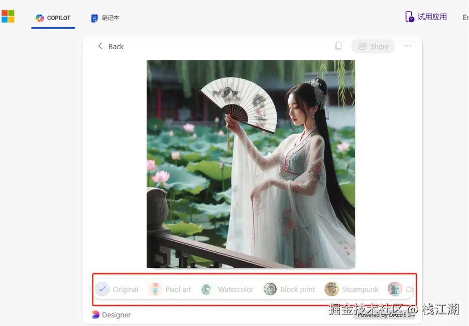 生成后还可以选择不同风格:如Original(原创)、Pixel Art(像素艺术)、Watercolor(水彩画风格)、Block Print(版画风格)、Steampunk(蒸汽朋克风格)、Claymation(黏土动画风格)、Art Deco(装饰艺术风格)、Low Poly(低多边形风格)、Origami(折纸风格)