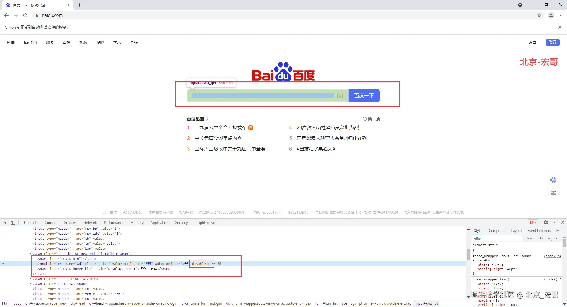 3.可能小伙伴后者童鞋们没有注意宏哥在录屏中点击输入框,通过JavaScript给输入框加入不可操作属性,宏哥在这里演示一下,仍然给输入框输入内容就会报如下错误: element not interactable (元素不可交互)。如下图所示: