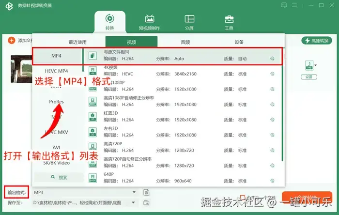 第二步:打开【输出格式】列表,在视频格式下选择【MP4】格式。