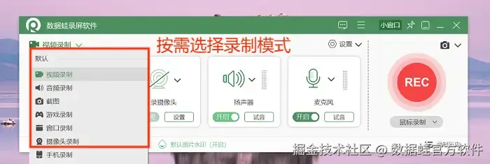 步骤1: 电脑录屏功能在哪里?首先在电脑上找到并点击打开数据 蛙录屏软件,进入软件后,可以在软件的左上角找到录制模式选择的选项,我们可以根据录制需求进行选择。本文以 “视频录制” 为例。