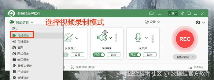 步骤1: 首先启动数据 蛙录屏软件,等待几秒后就能够看到一个简洁的界面啦。我们在主页面的左上角找到合适的录制模式并选择它,就可以开始录制了。本文以 “视频录制” 为例。