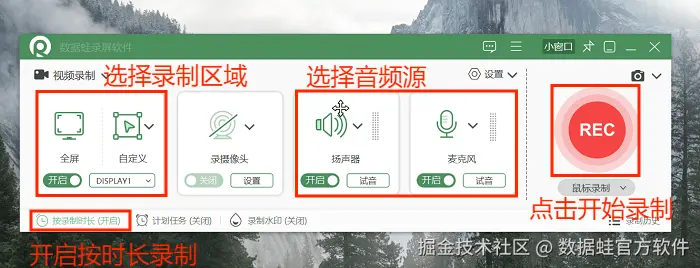 步骤2: 在视频录制模式中,我们可以按照需求选择合适的录制范围和音频源,如果需要录制内部音频就开启 “扬声器” ;录制外部音频就开启 “麦克风” 。如果有需要,还可以开启按时长录制,解放双手!设置完成后,点击 “REC” 就可以正式开始录制视频了。