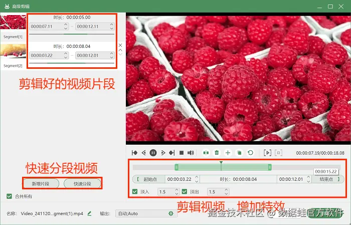 步骤3: 录制结束后,软件会自动弹出预览页面,我们可以在这个页面的右下角找到 “高级剪辑” 工具,可以对视频进行剪辑、增加特效等操作。