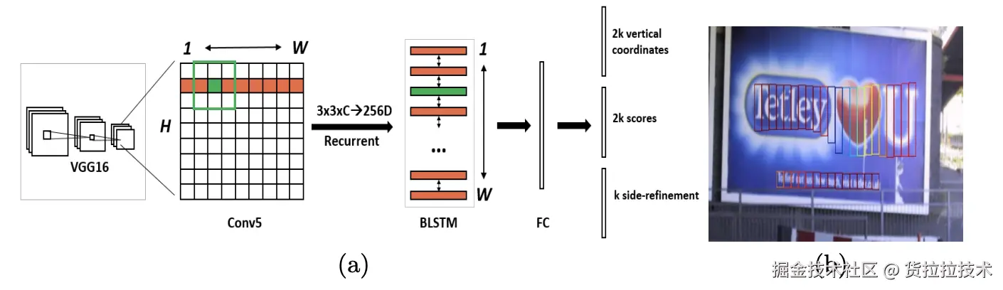 CTPN算法利用VGG16的卷积层进行特征提取,得到特征图。通过3x3滑动窗口扫描,特征图被转化为特征向量,并传入双向LSTM网络,以捕捉文本的序列特征。LSTM的使用有效得利用了上下文信息,提升了检测准确率。随后,特征向量进入全连接层,进行垂直坐标回归、分类得分和水平平移量回归的预测。这些结果确定了文本建议框的位置和形状。最后,CTPN算法合并并微调这些框,以形成完整的文本行并提高检测精度。