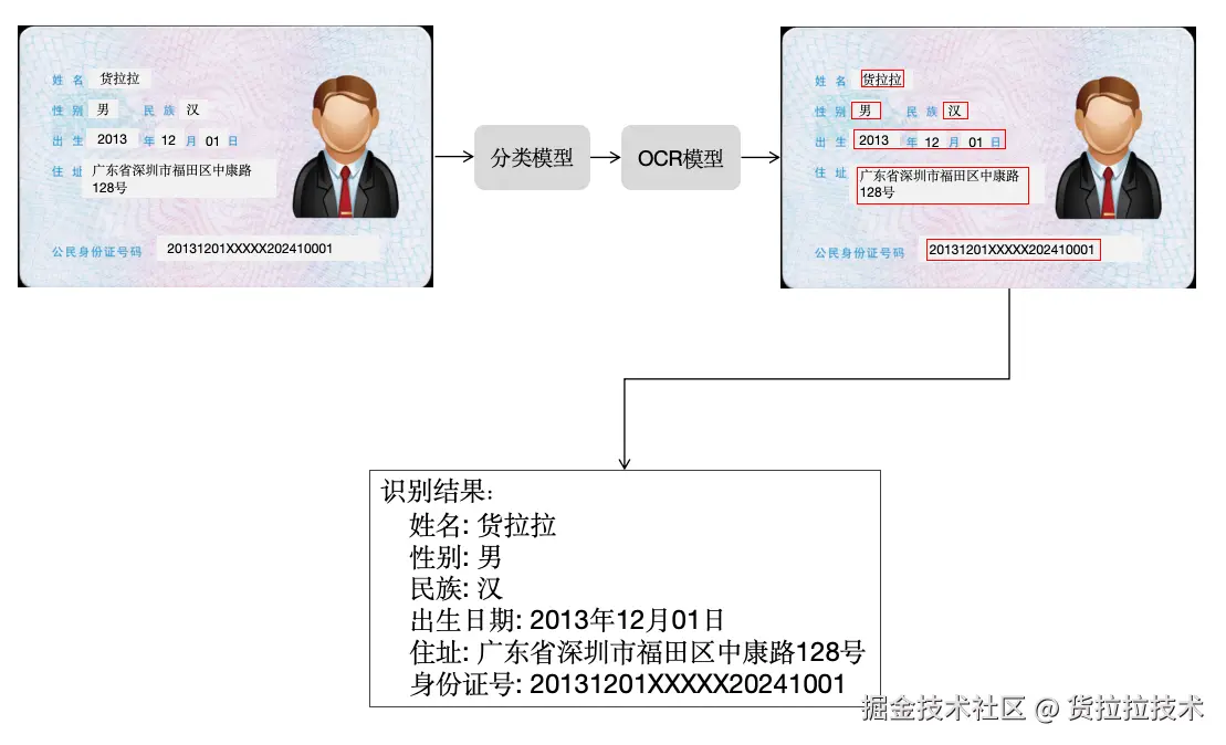 以身份证为例,如下是身份证识别流程示意图: