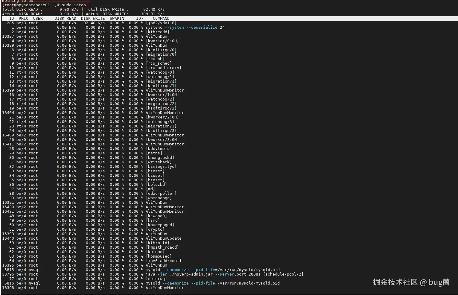 iotop命令进行操作了,iotop会显示出所有进程的磁盘读写速度,帮助你快速识别出性能瓶颈的源头。如果某个进程占用了大量磁盘 I/O,你可以考虑优化应用程序,或者将数据存储到更快速的设备上。
