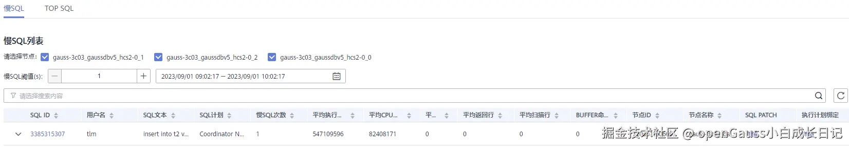 - 默认显示近一小时的数据,用户可自行选择时间区间,最多支持展示7天的慢SQL数据,可按照节点维度展示数据。