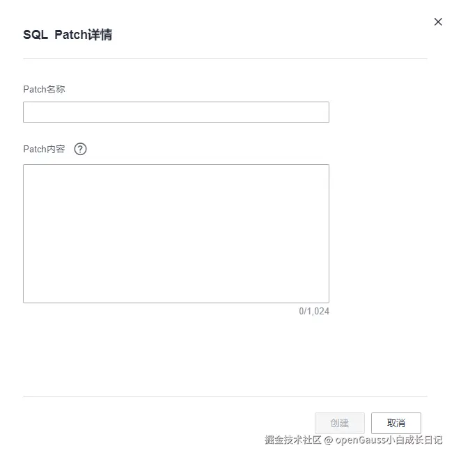 如果没创建SQL Patch,则可输入Patch名称和Patch内容,单击“创建”,则可创建SQL Patch。