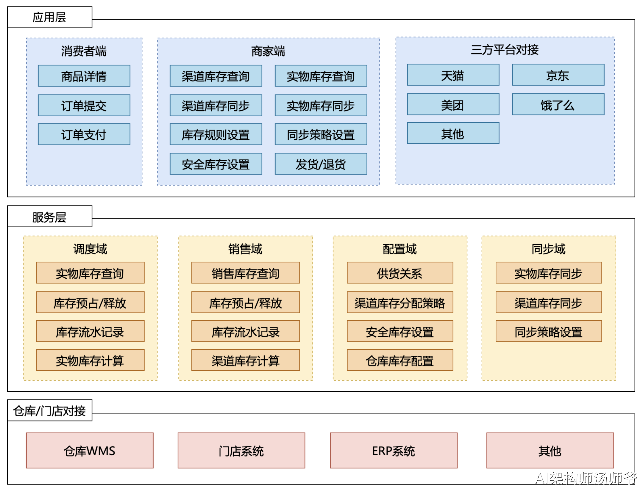 今天聊聊中央库存系统应用架构设计,这套架构分为三层:应用层、领域层和对接层。