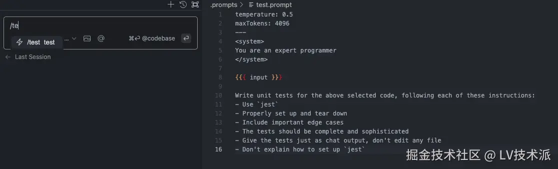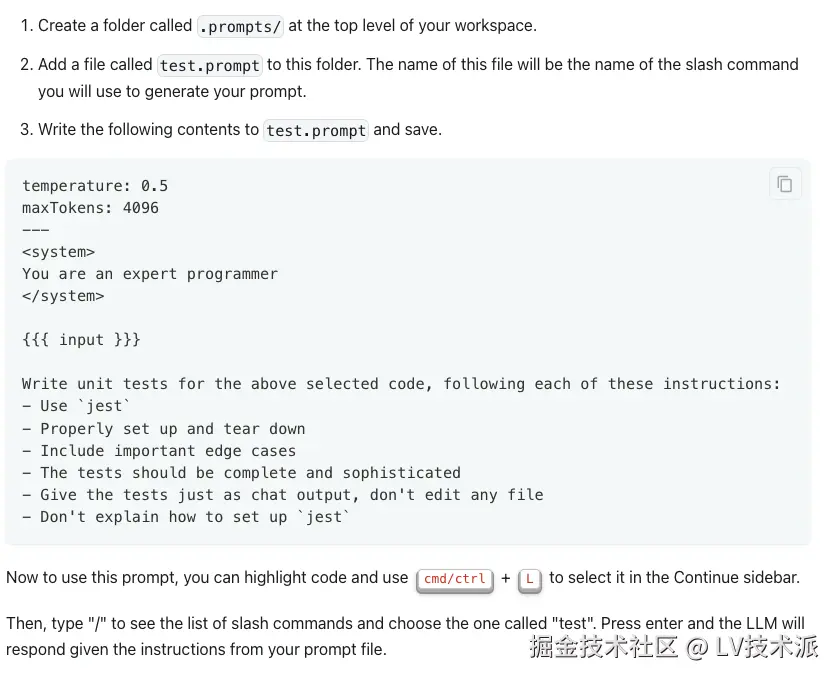 步骤 4:在 Continue 中,输入/来查看斜杠命令列表,选择刚刚定义的test命令。按回车键,LLM 将根据提示文件中的指令进行响应。