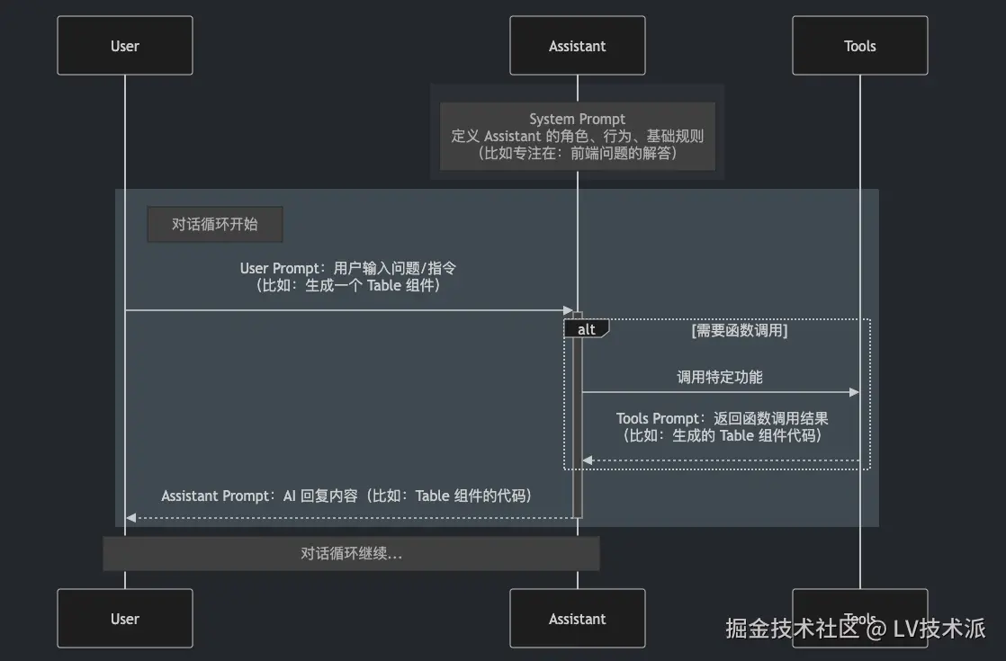 市面上大家讨论的提示词工程,主要集中在如何编写 System Prompt,它决定了 AI 会用什么样的内容(Assistant Prompt)来回复用户的需求(User Prompt)。