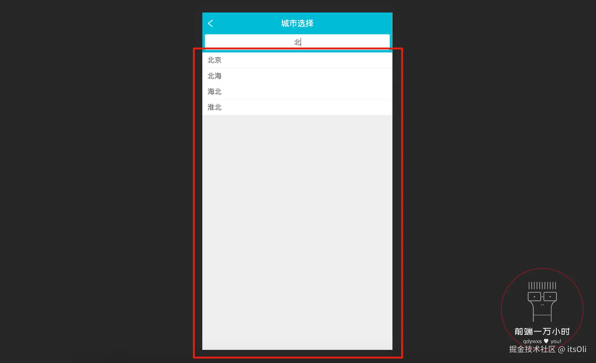 但,城市列表的内容并不是“消失”了,它其实只是被“搜索内容”给遮挡住了。当进行搜索时,则显示对应搜索内容;当没有进行搜索时,就显示城市列表内容。