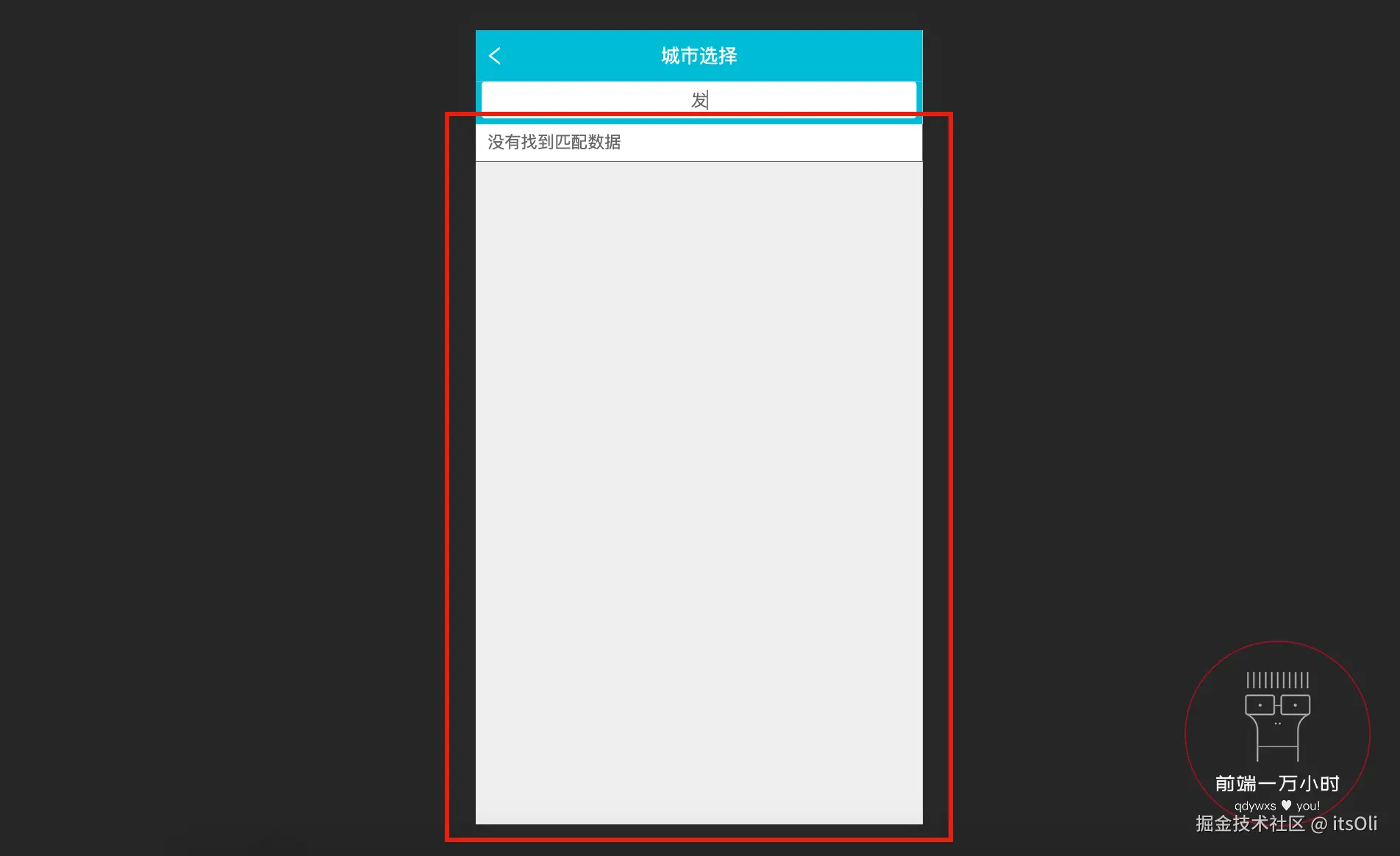 在城市选择页的搜索框中,无论输入的是“拼音”还是“文字”,搜索框下方都会显示筛选出的包含对应“关键字”的城市。当没有对应城市时,则显示“没有找到匹配数据”: