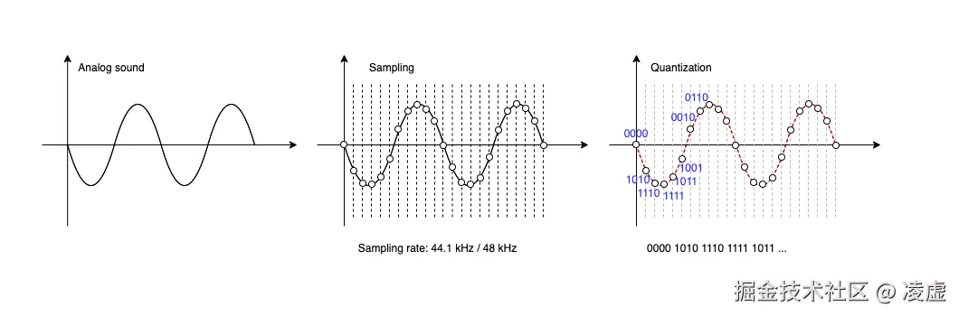 如上图所示。声波最开始是一个连续的模拟信号,然后经过特定频率的采样得到采样点(比如采样频率 48kHz 就是将每秒切割为 48k 个采样点),再通过量化处理得到二进制数据(如果量化位数是 16 位,则表示每个采样点存储为 16 bit 即 2 个字节),最后将元数据(如采样率、量化位数、声道数量等)和采样点二进制数据组合起来就得到了音频文件(比如 WAV 或 MP3)。