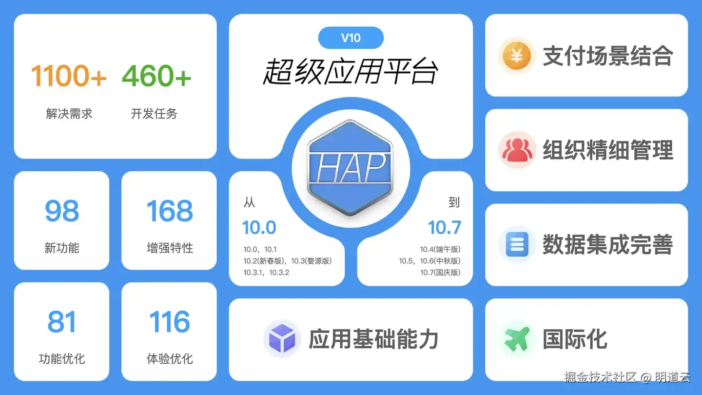 明道云CPO薛宗铭总结了过去一年以来HAP在产品研发上的成果。从去年10月份HAP V10发布至今,V10.x系列版本共经历了7次版本发布,推出98个新功能和168个增强特性,解决超过1100个需求。应用基础能力加强、支付场景结合、组织精细管理、数据集成完善、产品国际化,是今年明道云HAP产研团队的发力重点。