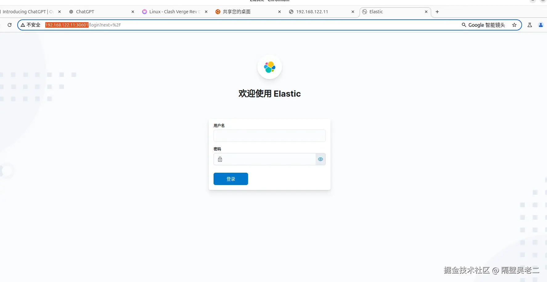 访问kibnaa,用户名、密码elastic/admin@1233