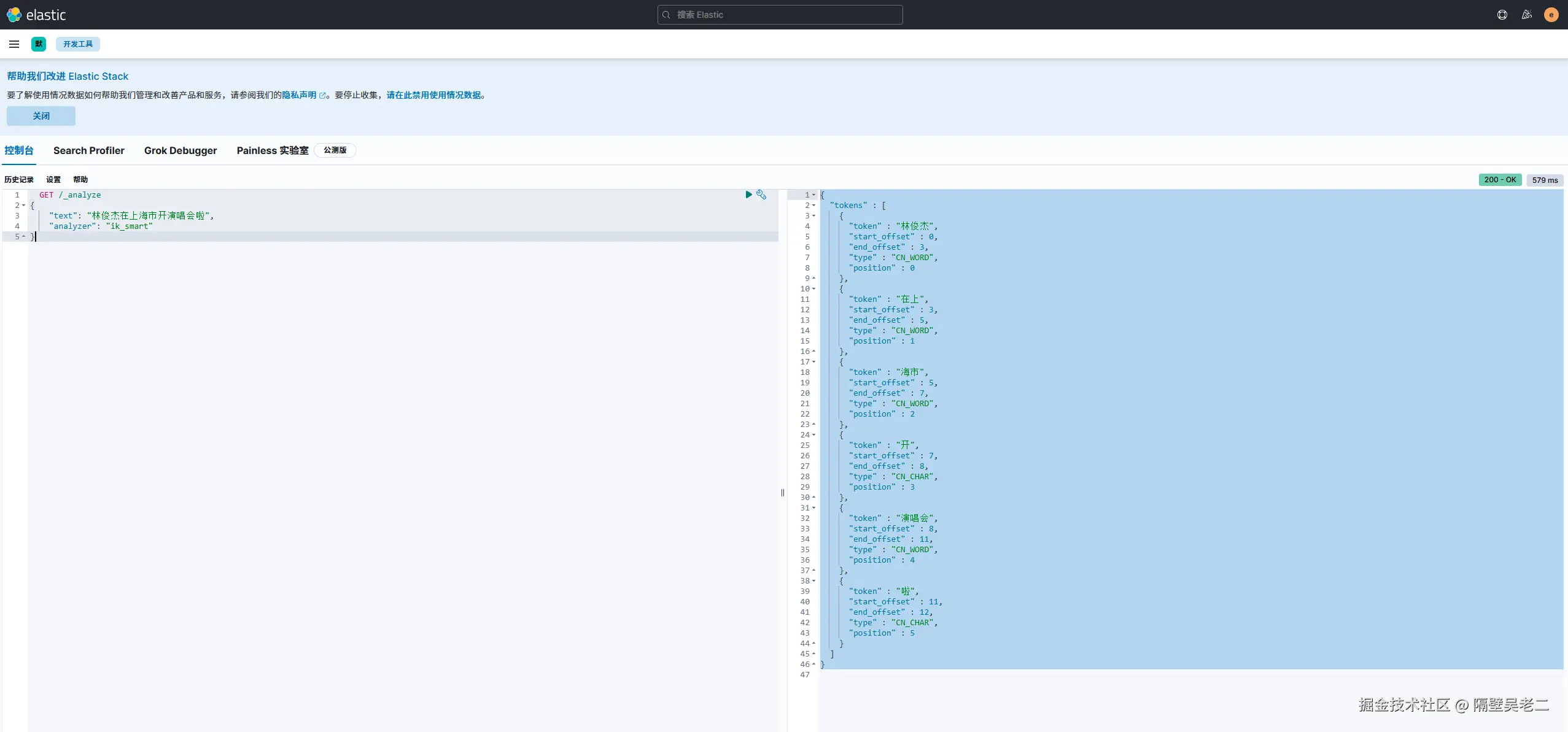 最后进入kibana测试,发现ik分词器成功。