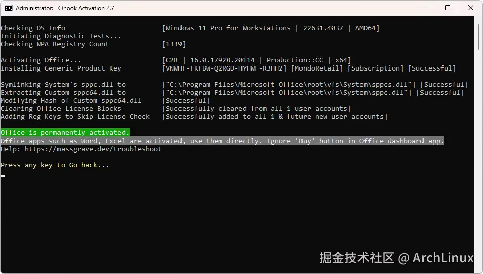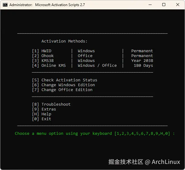 3. You will see the activation options. Choose [1] HWID for Windows activation. Choose [2] Ohook for Office activation.