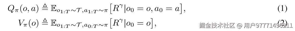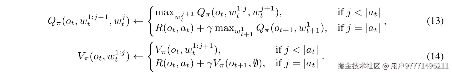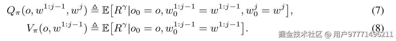 - 𝑄𝜋(𝑜,𝑤1:𝑗−1,𝑤𝑗)和 𝑉𝜋(𝑜,𝑤1:𝑗−1) 分别是针对特定标记序列的行动-价值函数和状态-价值函数。