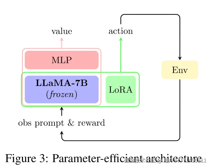 我们在LLaMA - 7B模型的最后一个transformer blocks模块中添加了额外的MLP层作为critic。critic的MLPs使用观测提示的最后一个token作为输入,输出观测提示的估计值。输出观测提示的估计值。另一方面,Actor是由冻结的LLaMA - 7B模型随着LoRA参数的增加而形成的。在训练过程中,只更新Critic的MLP和Actor的LoRA参数,使得训练更加高效。LLaMA - 7B模型也可以作为参考模型来规范模型的更新.