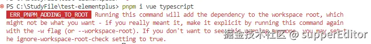 在根目录下安装 vue 和 typesrcipt ,在根目录下需要用 -w 表示是在根目录下安装依赖。否则提示以下错误。