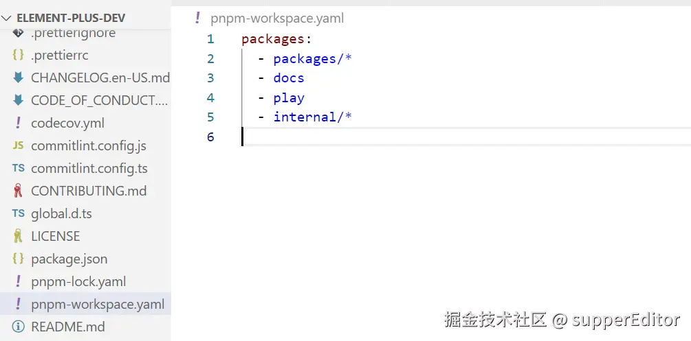 Element Plus 中主要使用的是 pnpm 的 monorepo ,只需要在根目录下新建 pnpm-workspace.yaml 文件,并声明想要在全局使用的工作区就可以了。