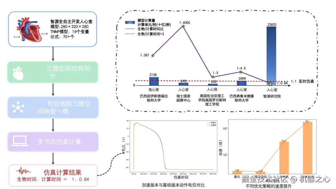 最终,智源虚拟心脏仿真系统实现了对心脏电生理功能的实时仿真,达到生物时间与计算时间比为 1:0.84。这一成果不仅提升了心脏仿真系统的性能,还为更广泛的医学研究和临床应用提供了强有力的支持,标志着心脏仿真技术的又一重大里程碑进展。