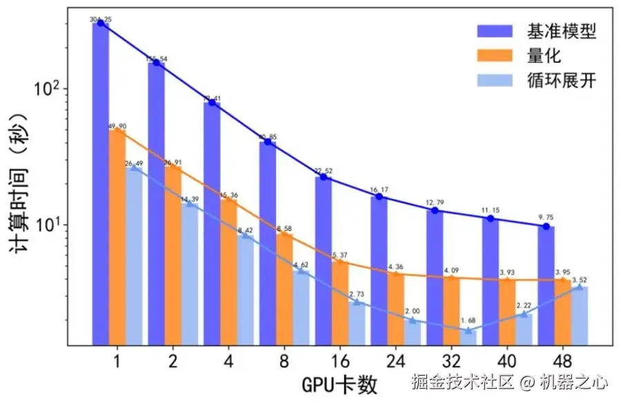 如图 7 扩展曲线所示,随着 GPU 卡数的增加,基准模型和优化后的模型仿真时间都在减少。基准模型在增加到 48 卡后,计算时间不再减小。此时的生物:计算时间比为 1:5。再采用量化和循环展开策略后,32 张卡即可实现实时计算,生物:计算时间比达到 1:0.84。