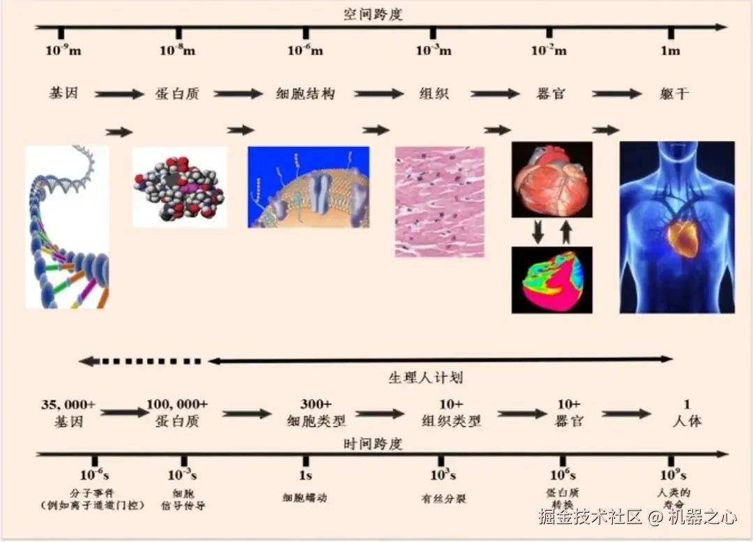 图注 1:构建虚拟生化生理人体的时间和空间尺度。时间尺度横跨由分子事件(µs)、细胞信号传导(ms)、细胞功能(s)到人体寿命 (decades) 的 10^15 跨度。空间尺度横跨由分子(nm)、细胞(µm)、器官(cm)到躯干 (m) 的 10^9 跨越。
