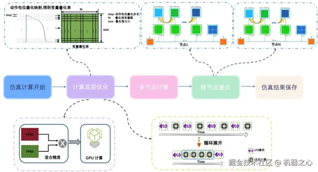 智源研究院从心脏模型的解剖结构、心肌细胞电生理的计算特点及计算系统的硬件架构出发,设计了心脏仿真系统的数据结构和优化策略,以提高计算效率。团队采用先进的并行处理方法,充分利用现代 GPU 设备的强大计算能力,优化数据传输和通讯方式,以减少延迟并提高数据吞吐量。通过这些策略,不仅提升了仿真系统的计算速度,还保证了在可接受误差范围内的计算精度,最终成功实现了心脏仿真的实时计算目标,达到超实时计算结果。这一成果为进一步研究心律失常产生的离子通道与分子机制等关键医学问题,也为手术规划如房颤射频消融方案等临床应用,以及新药研发与其心脏安全性筛选奠定了坚实基础,同时也为其它超大复杂物理系统的实时仿真提供坚实基础。