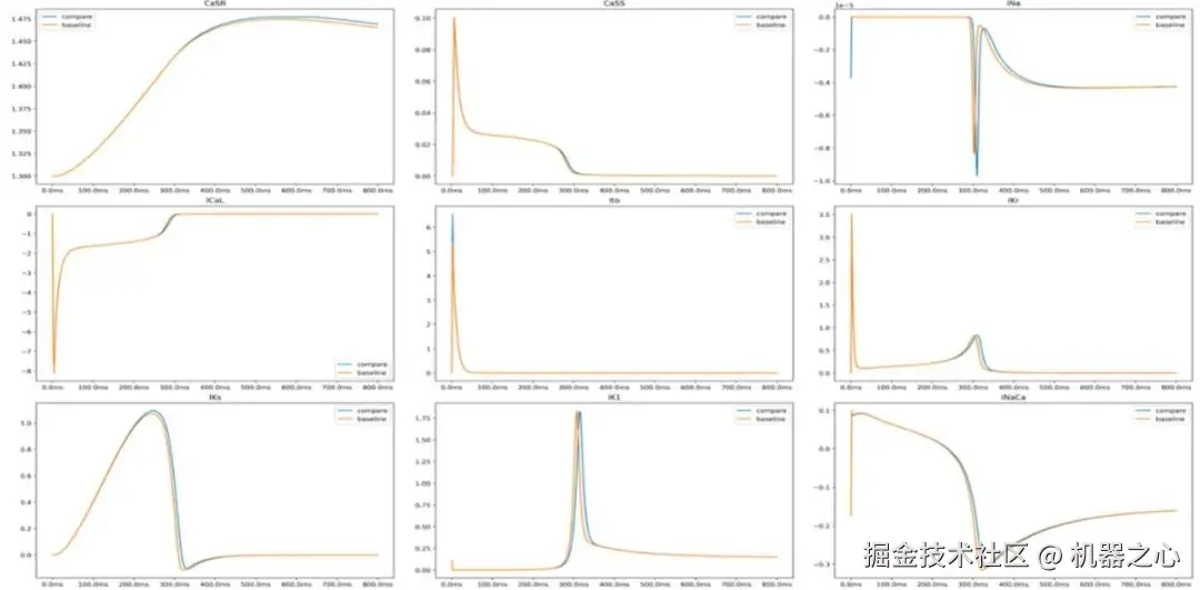 团队统计了加速前与加速后的结果误差,仿真的膜电位 V 的时程差别 <2 ms (0.6%),模电位平均误差为 0.72mV (0.4%),均满足生理准确度要求。优化前后主要离子通道的仿真曲线吻合(如图 10 所示)。