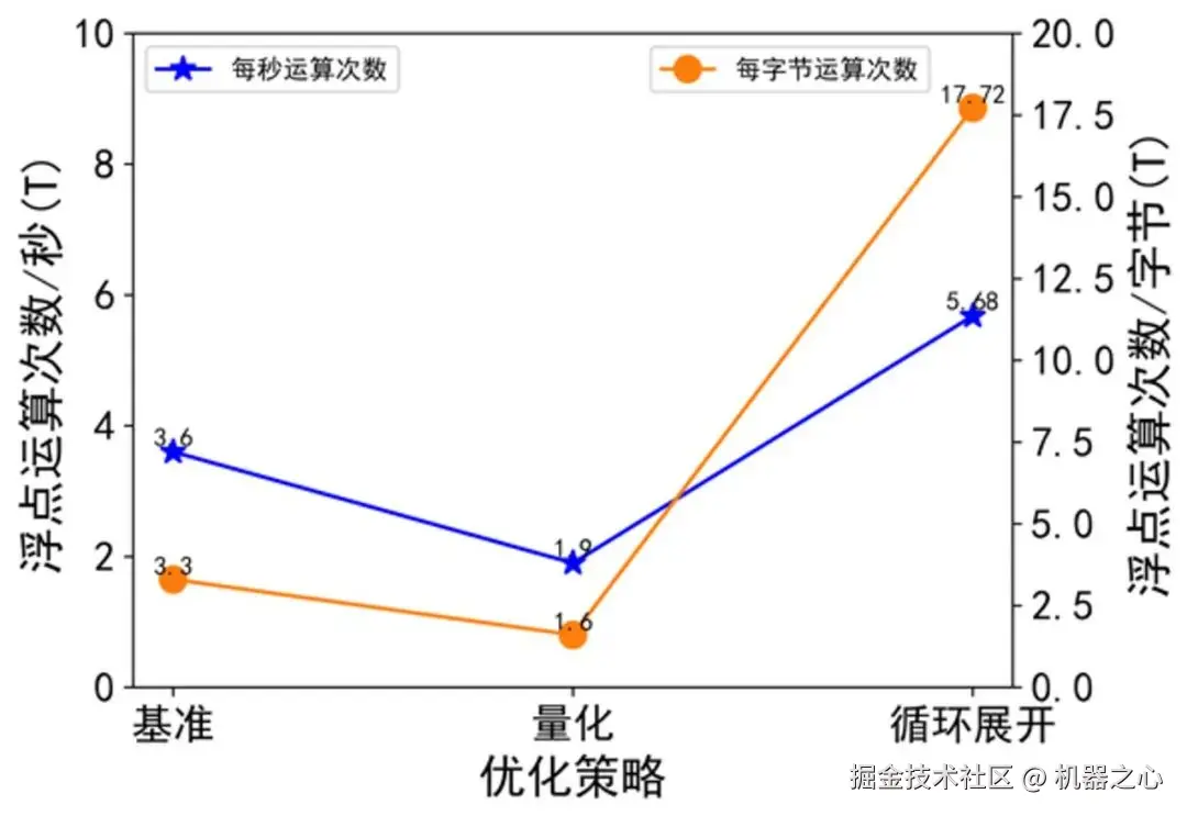 图注 8:不同优化策略的计算密度和计算强度。