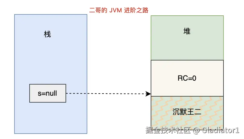 我们来创建一个字符串,这时候"沉默王二"有一个引用,就是 s。此时 Reference Count 为 1。