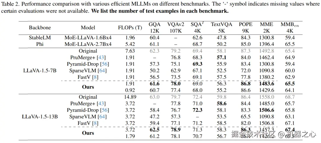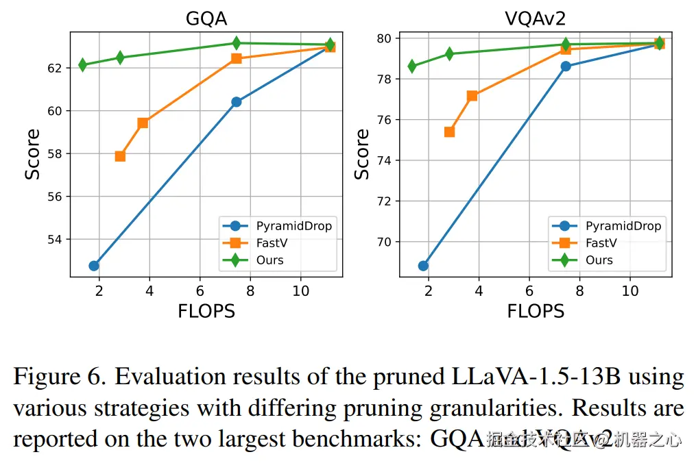 研究团队在众多常见基准上评估了他们提出的方法在剪枝 LLaVA-1.5-7B 和 LLaVA-1.5-13B 模型中的效果。由表中得知,在相同的计算预算(即相同的 FLOPs)下,团队提出的剪枝方法在四个样本较多的基准测试上一致性得取得了最佳结果,分别在 GQA、VQAv2、POPE 和 MMB 上比第二优方法平均高出 3.7%、1.1%、2.2% 和 0.45%。