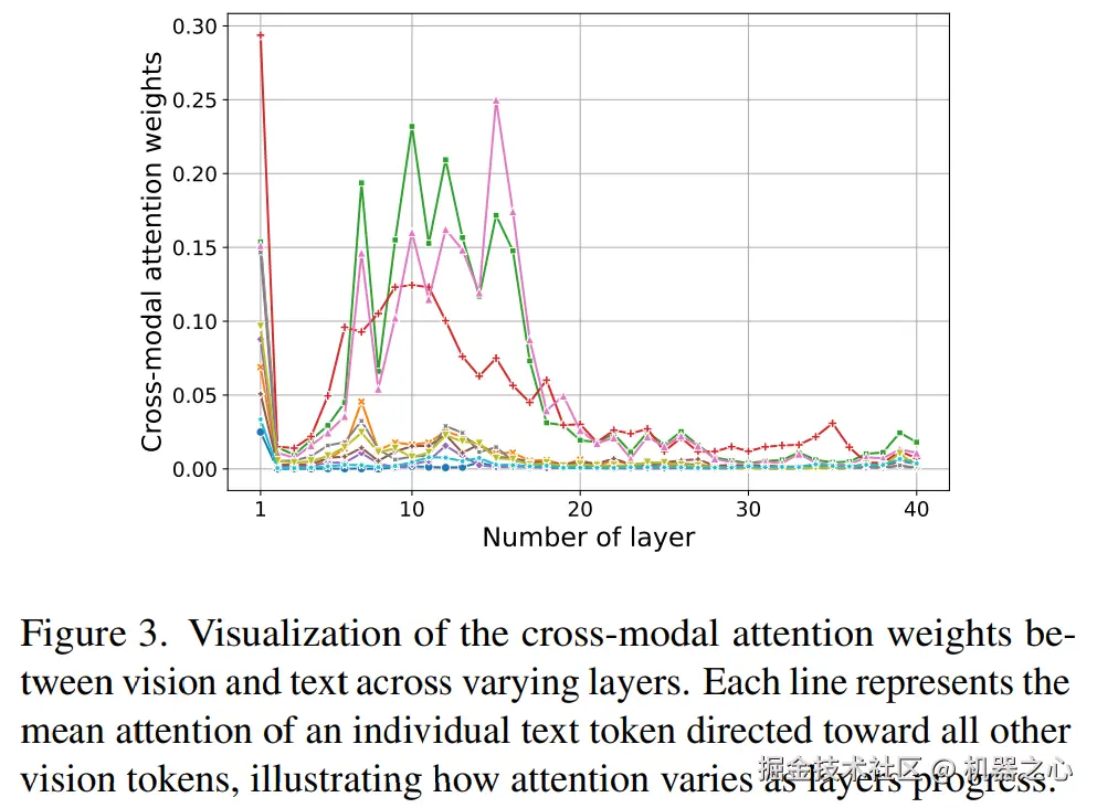 3 选择性层丢弃: 研究团队通过可视化 LLaVA-1.5 不同层的视觉 token 跨模态注意力权重发现,大权重集中在前 20 层,在第 20 层到 40 层之间权重接近于 0。